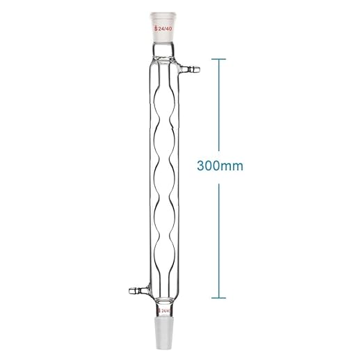 The durable borosilicate glass ensures resistance to thermal shock, chemical corrosion, and mechanical stress, allowing the condenser to withstand repeated heating and cooling cycles without compromising performance. Its 24/40 standard ground glass joints provide secure, leak-proof connections with flasks, adapters, and other laboratory glassware, supporting versatile experimental setups and complex chemical processes.